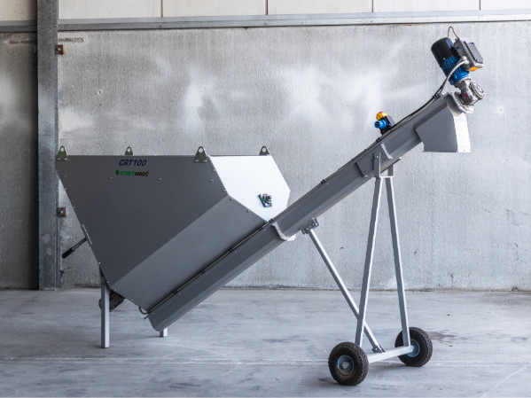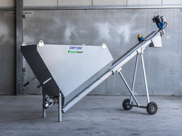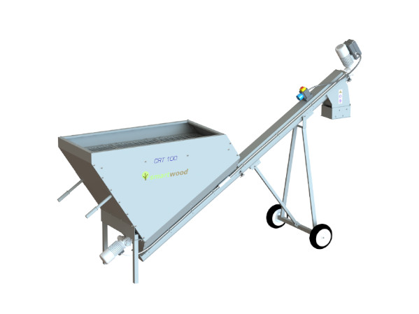 Tolva dosificadora mediante sinfín. Dispone de un motor inverter para la regulación de la carga del material y removedor anti bóvedas. Incluye el refinador RC400, el extractor de metales DFM500 y la preinstalación del pulverizador del Kit humidificador.